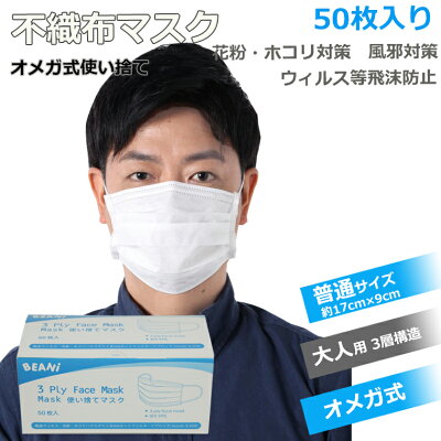 【埼玉県より翌営業日までに発送】 マスク 50枚 普通サイズ 不織布マスク 3層構造 使い捨てマスク オメガ式 4段プリーツ 箱入り 不織布 大人用 コロナウィルス対策 ますく ウイルス 防塵 花粉 飛沫感染対策 インフルエンザ 風邪 43msk01